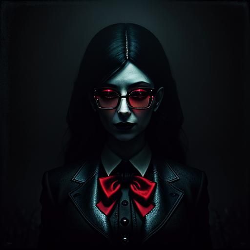 A striking picture of a pregnant woman in a dark suit holding a red bow tie. This macro photograph uses tilt-shift focus, lens flare, and bokeh in a fauvist expressionist style. The image has a gothic, eerie, and surreal aesthetic.