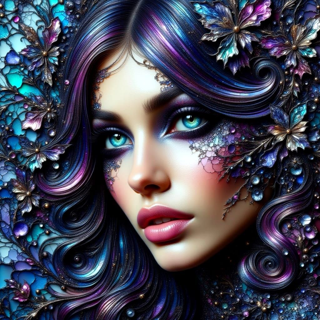 This image features a close-up portrait of a beautiful woman with dark hair, plum streaks, and turquoise eyes, set against a textured background with blue, aqua, and plum hues, created in a style reminiscent of oil painting with impasto and crinkled metallic effects.