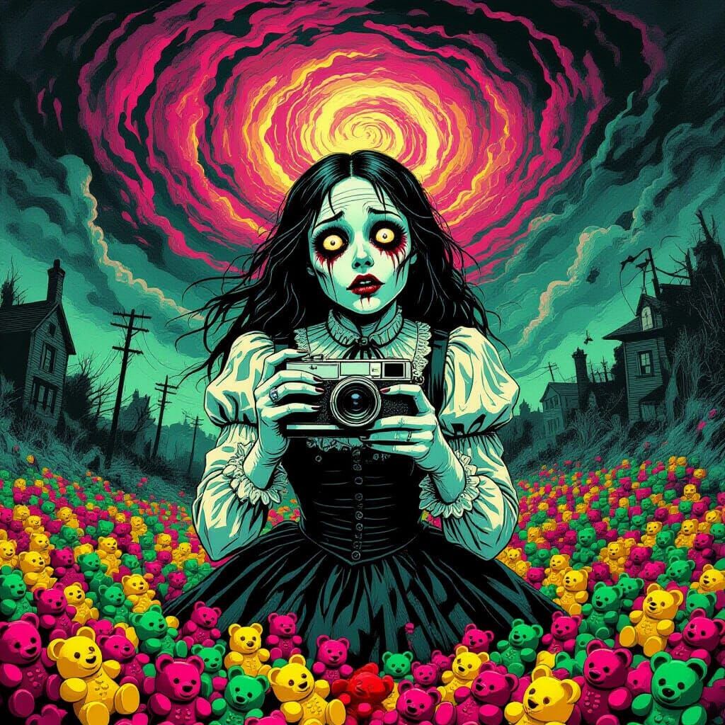 A haunting image of a ghostly figure with a vintage camera, set within a surreal and nightmarish landscape. The artwork features swirling skies in violent magenta and emerald, with biomechanical horror elements.