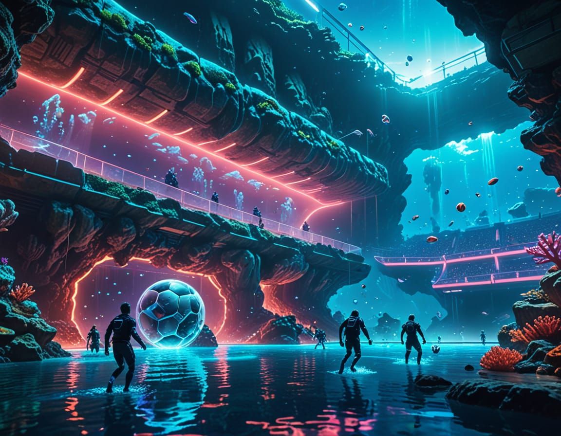 This image shows divers playing soccer in an underwater stadium, rendered as vibrant digital art. Futuristic architecture and neon lights illuminate the scene, with glowing coral reefs and translucent sea caves.