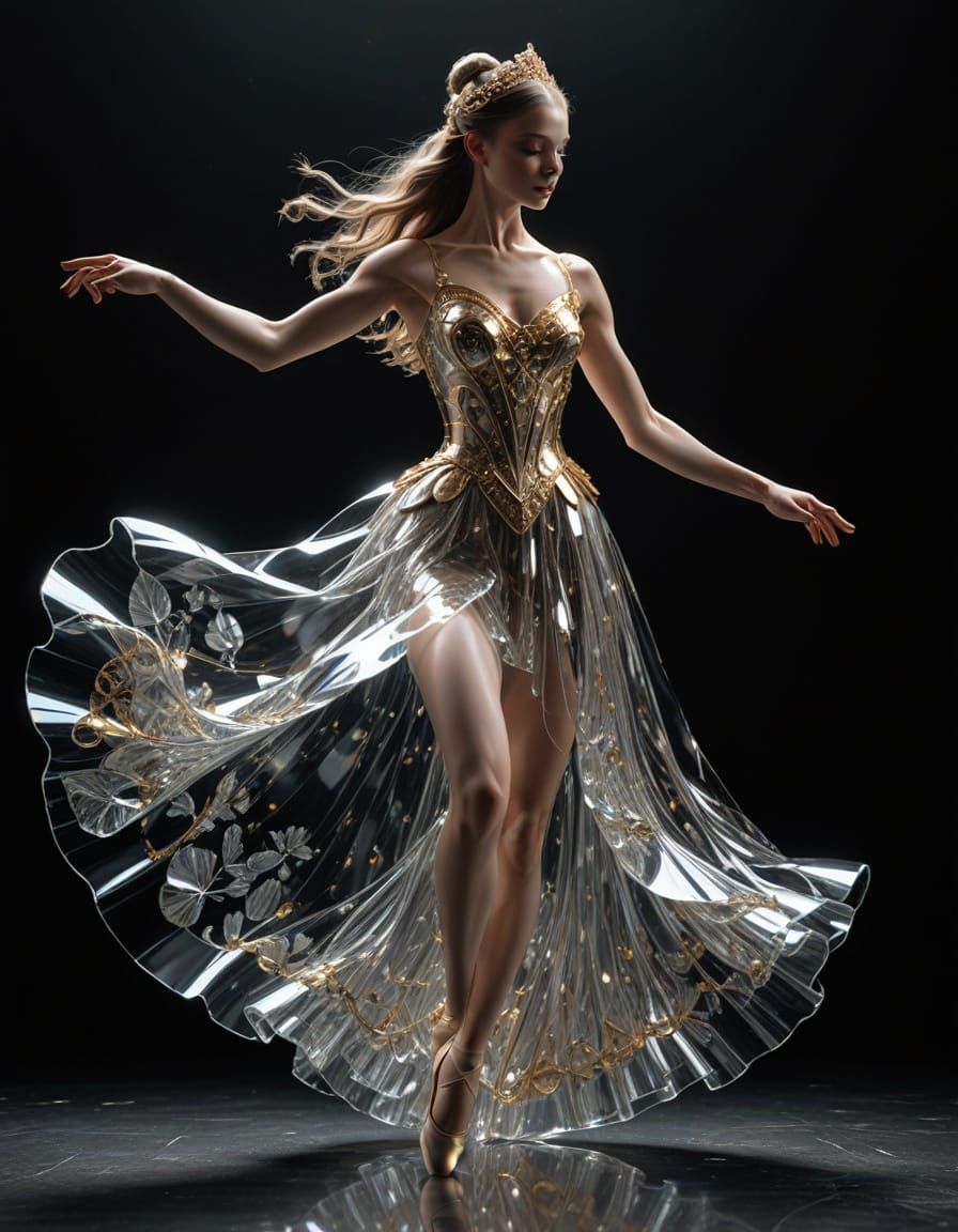 A striking image of a ballerina with long hair dancing in a dress made of reflective, sharp glass shards. Features dark, dramatic lighting and intricate detail.