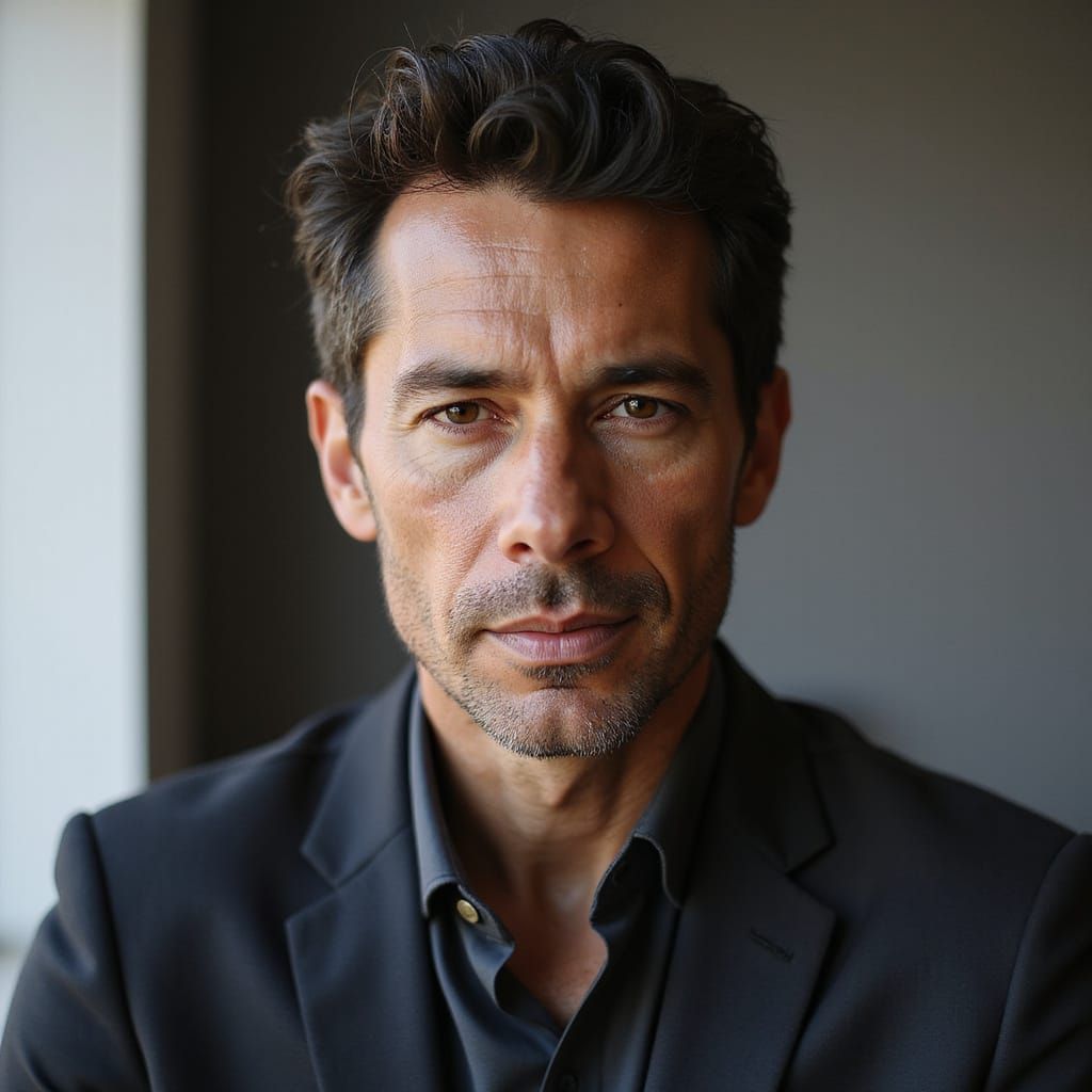 This image is a masterful portrait of a confident adult, captured in a studio setting with soft, natural light and a shallow depth of field. The subject's piercing eyes and expressive features are the focus, with a crisp, high-fashion aesthetic that emphasizes their inner strength and poise.