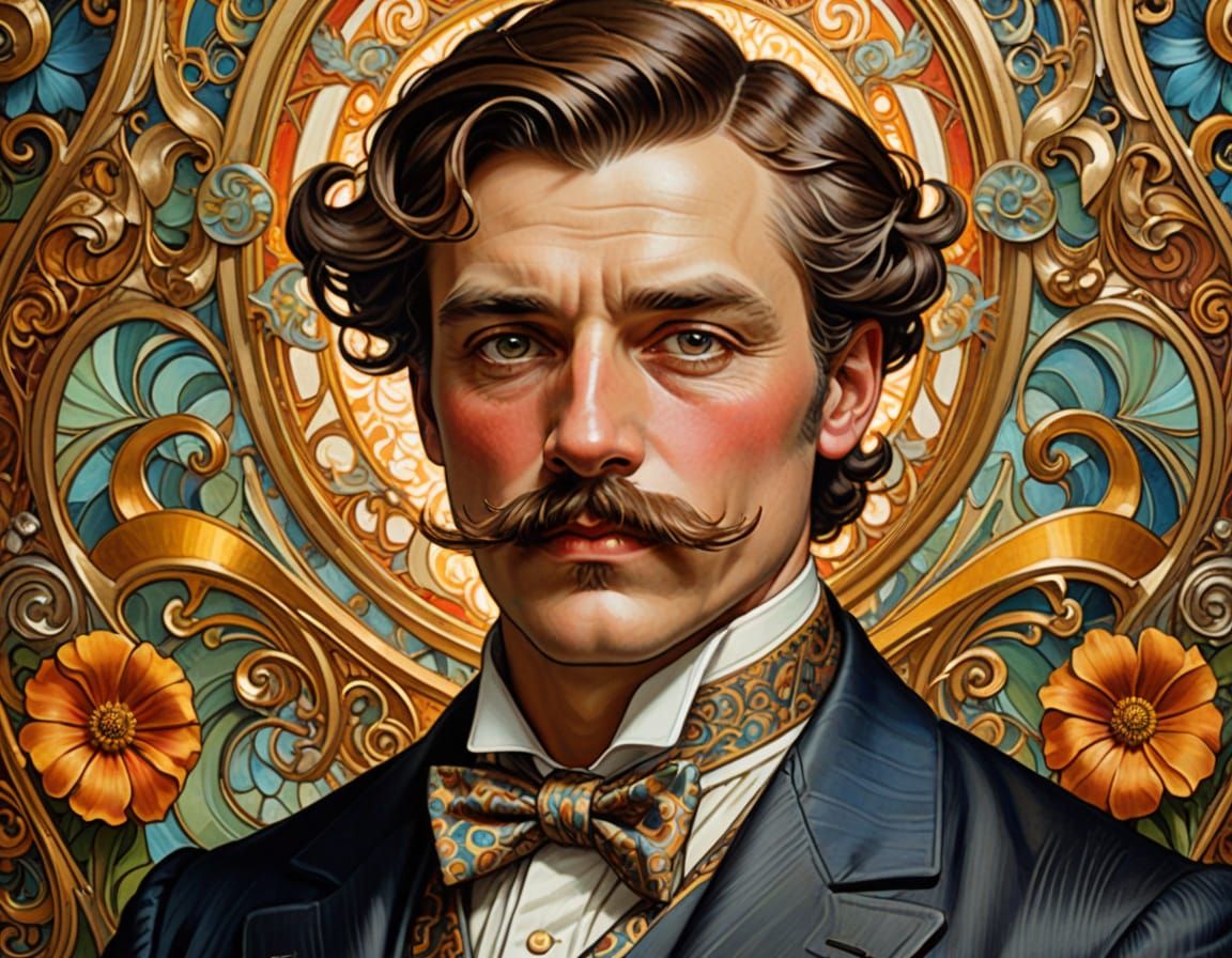 A close-up portrait of a dandy with a decorated mustache, rendered in an Art Nouveau style. The image features swirling ornaments, vibrant stripes, and dramatic golden lighting.
