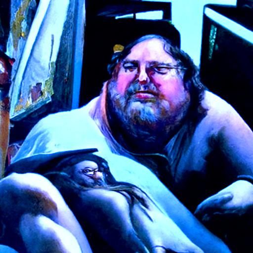 This image depicts a man with a neckbeard intently watching pornography. The artwork is rendered as an oil painting, reminiscent of James Gurney's style, with detailed textures.