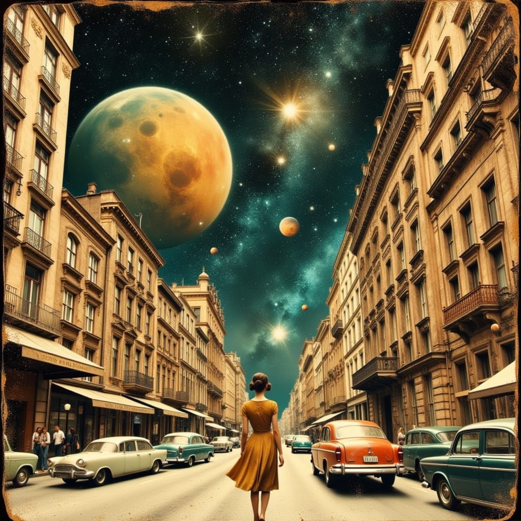A mixed media collage depicts a 1950s city street with classic cars and fashion. The scene features a surreal, retro-futuristic night sky with vibrant planets and nebulae, presented with tactile surfaces and layered elements.
