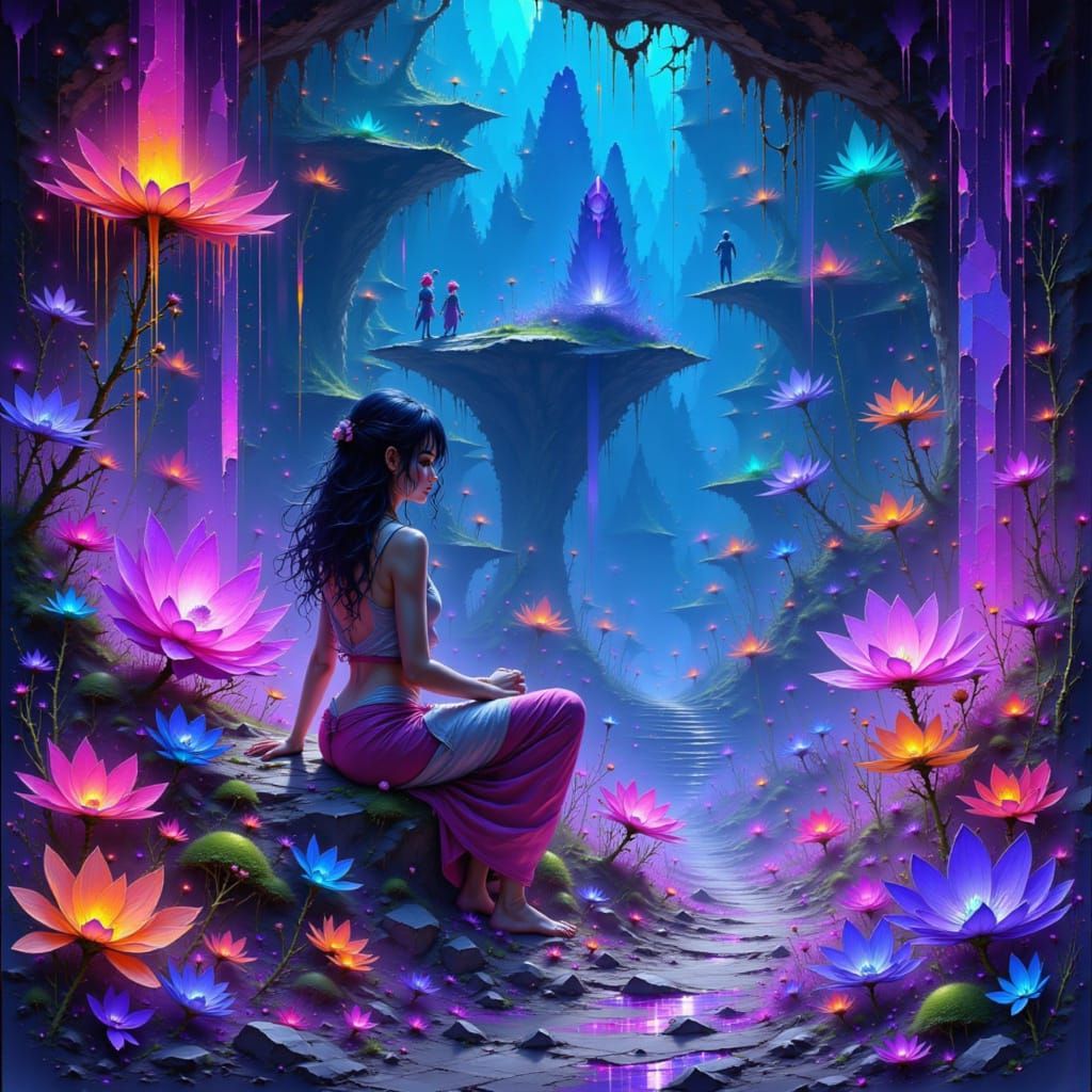 This image shows a female adventurer in a glowing crystal cave. Dragons, seahorses, and chimeras surround her amongst luminous plants and gemstones with iridescent and metallic elements in a dimly lit environment. The style is reminiscent of neon ink splatter art.