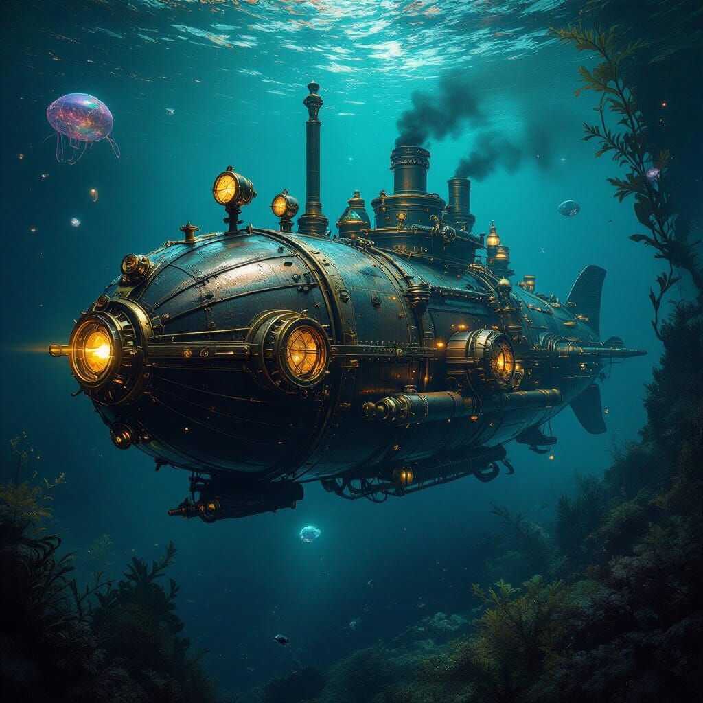 Dive into your own steampunk submarine adventure! Create unique images with our AI image generator, it's free and easy!