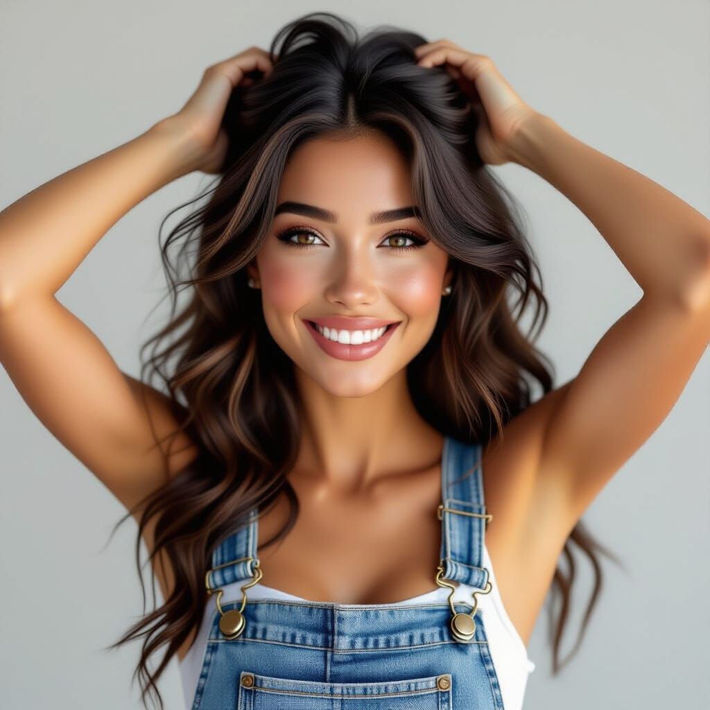 A black and white portrait of a woman with a radiant smile, showing her teeth, and bright eyes that convey happiness and confidence. She has long, wavy hair cascading over her shoulders, with some strands tucked behind her ear, adding a sense of effortless elegance. Her pose is dynamic, with both ...