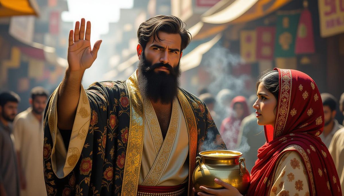 This image depicts a well-dressed, bearded man calling out to a woman holding a pot in a bustling marketplace. The scene is rendered with dramatic lighting and textures, in a detailed, emotionally intense style.