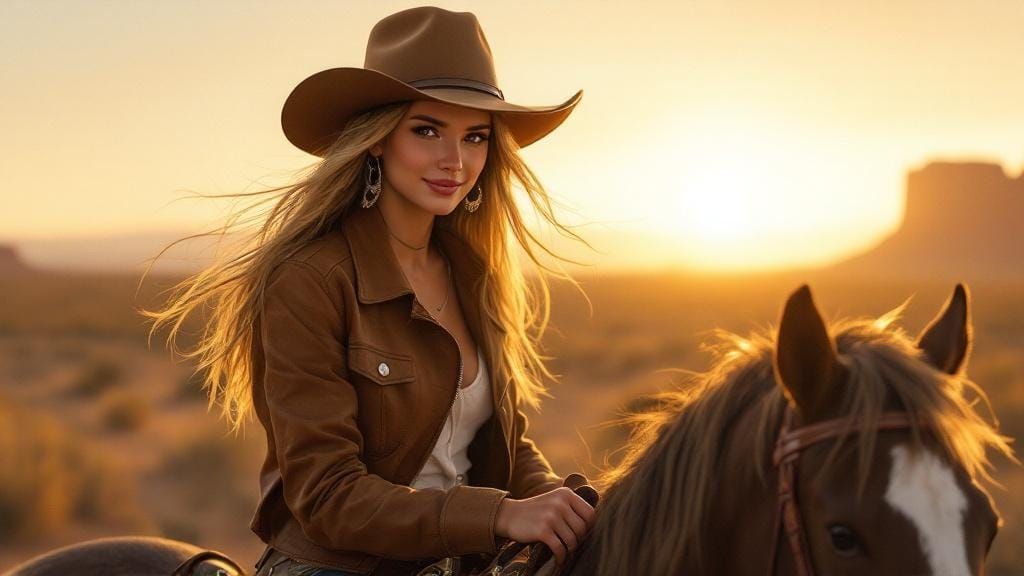 A striking picture of a cowgirl with long blonde hair, wearing a cowboy hat and leather jacket, smiling gently on horseback. The scene is set in a vast Southwestern desert during the golden hour, rendered with painterly precision.
