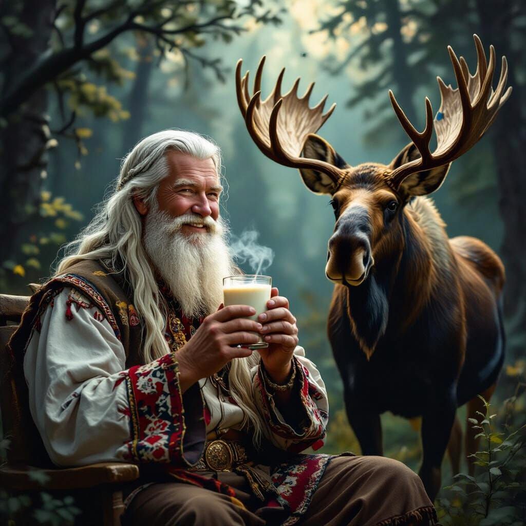 This hyperrealistic image depicts a smiling Finnish man in traditional attire sharing a moment with a moose in a dimly lit, ethereal forest.