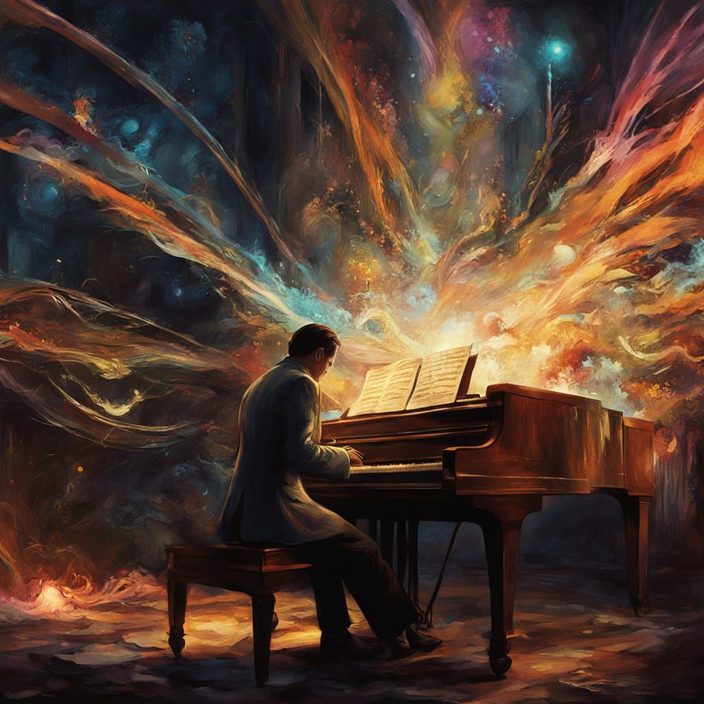 This digital painting captures a pianist whose touch on the keys unleashes a vibrant spectrum of colored lights. Swirling abstract patterns and ethereal energy trails create a magical, energetic scene with impasto texture.