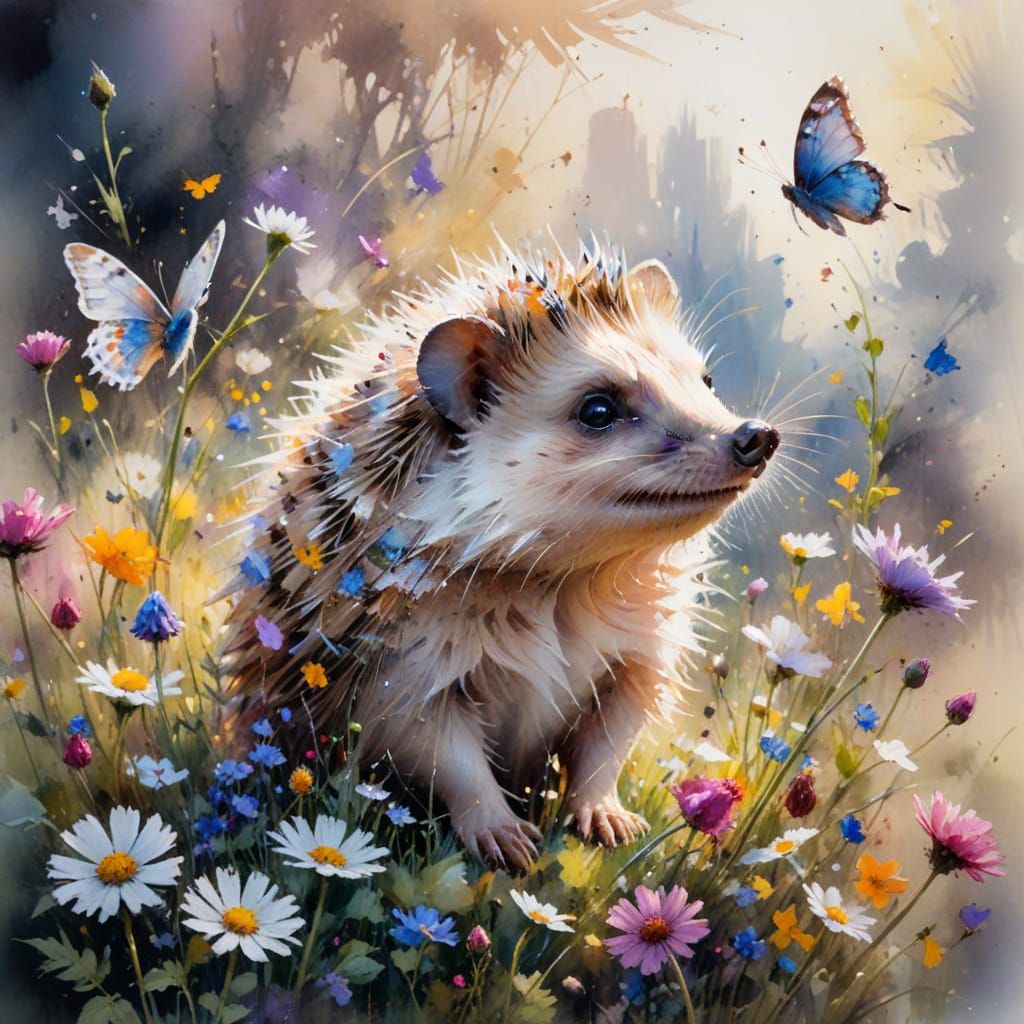 A charming picture of a hedgehog amidst flowers in a sunlit butterfly garden. The artwork combines expressive watercolor techniques with ethereal stylization, creating a mesmerizing fusion of chaos and beauty.