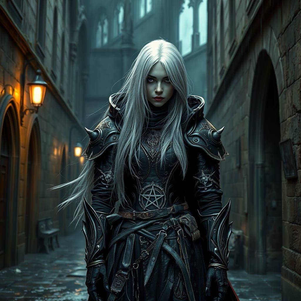 This image shows a mysterious female inquisitor standing watch in a dimly lit alleyway, surrounded by crumbling Gothic architecture and eerie occult symbols, blending dark, gothic art with gritty, industrial landscapes.