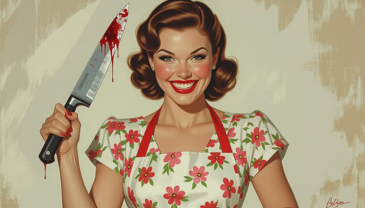 This image shows a woman in a vintage dress and bloodied apron, smiling eerily while concealing a knife. The photorealistic rendering features dramatic lighting and a vibrant color palette.