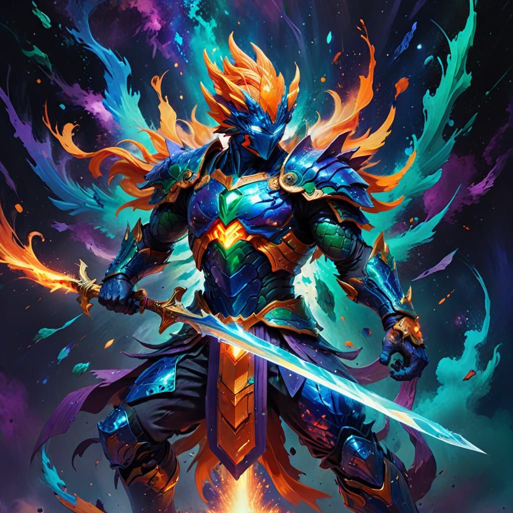 He wields an elemental holy-demonic sword, crackling with energy, its blade etched with glowing, striped runes.