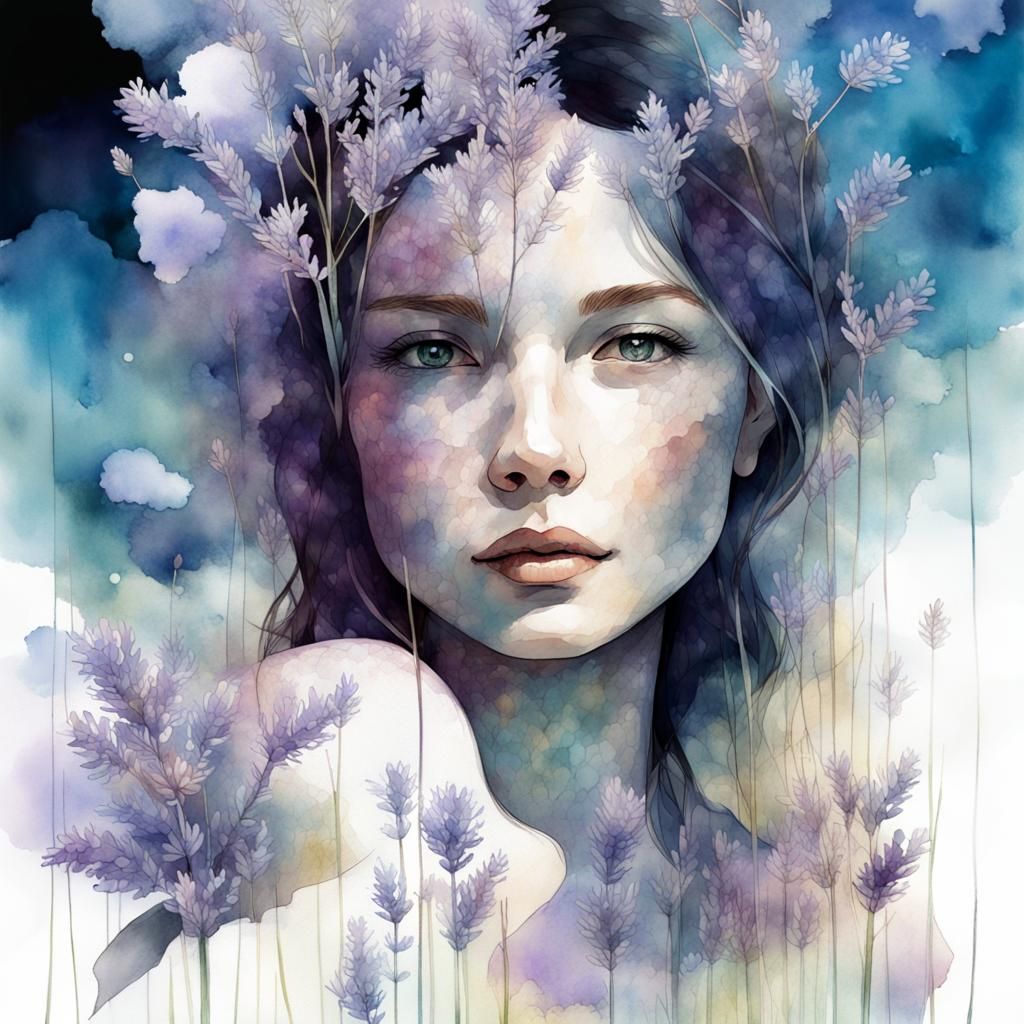 A beautiful lauered merged double exposure of a digital watercolor ink illustration of a sunny lavender field and a woman to form a composite image, 8k resolution art, by Miho Hirano and lisbeth zwerger, softly natural, gently delicate, in art brut style