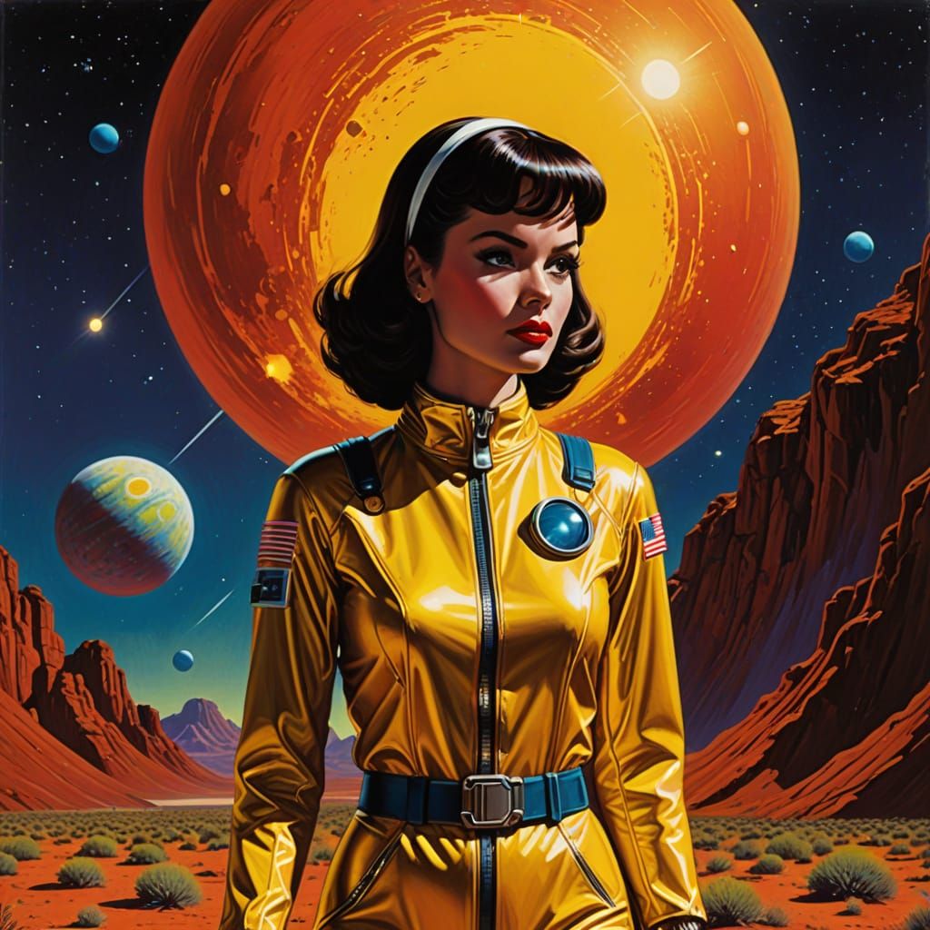 A striking picture of a woman in a yellow space suit, reminiscent of 1950s pulp fiction. The image features bold lighting on an alien planet with vibrant, unusual moons.
