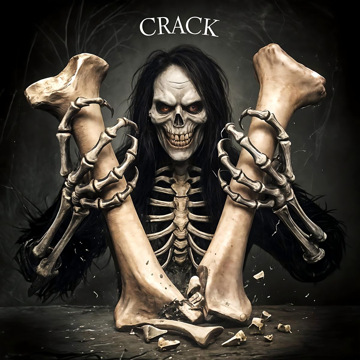 A chilling scene of a shadowy, grinning figure crushing a femur bone with long, skeletal fingers. Bone fragments scatter against a dark, misty background in this gothic horror image.