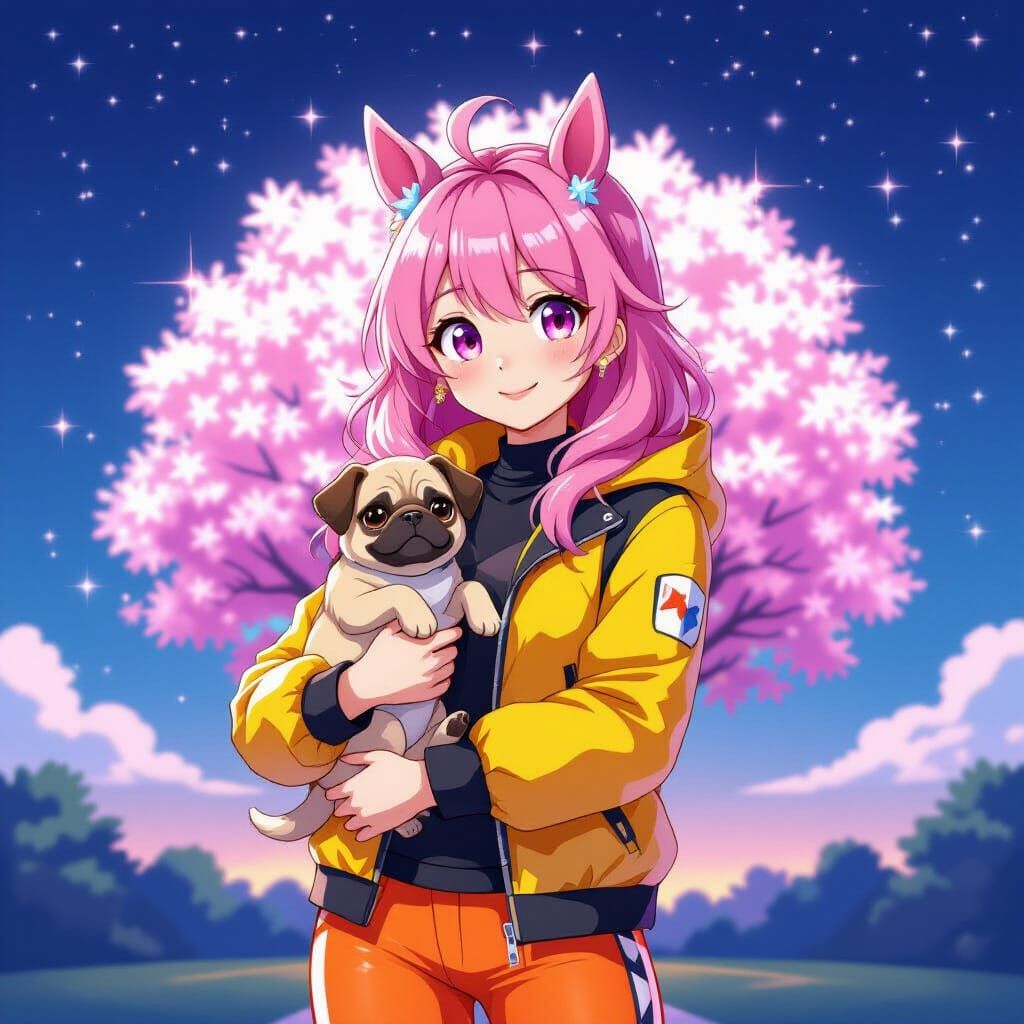 This image shows a cel-shaded anime girl with horse ears holding a pug puppy. She is set against a backdrop of a sparkling tree under a starry night sky in a manga style.