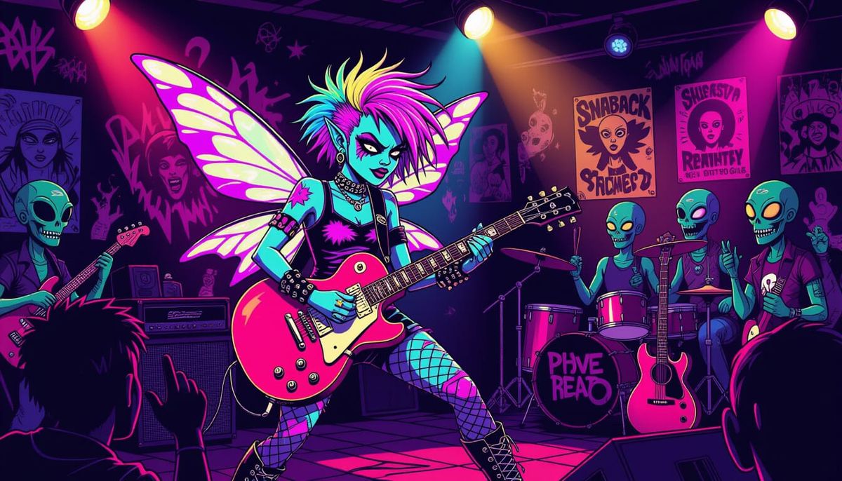 A vibrant image of a punk rock fairy playing electric guitar in a dive bar. The scene is filled with aliens and graffiti, rendered in a cyberpunk comic book style.