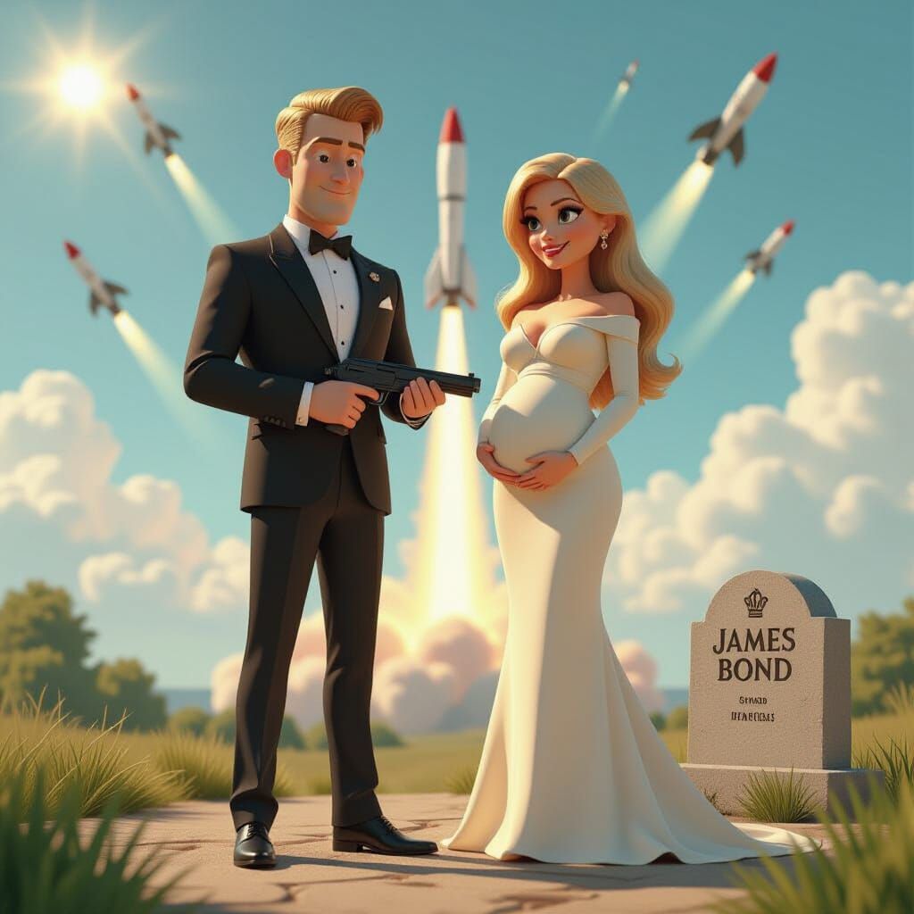 This image shows a dramatic scene with a man and pregnant woman on a missile bunker. Missiles streak across the sky in this vibrant, Pixar-inspired 3D rendering with cinematic post-processing.