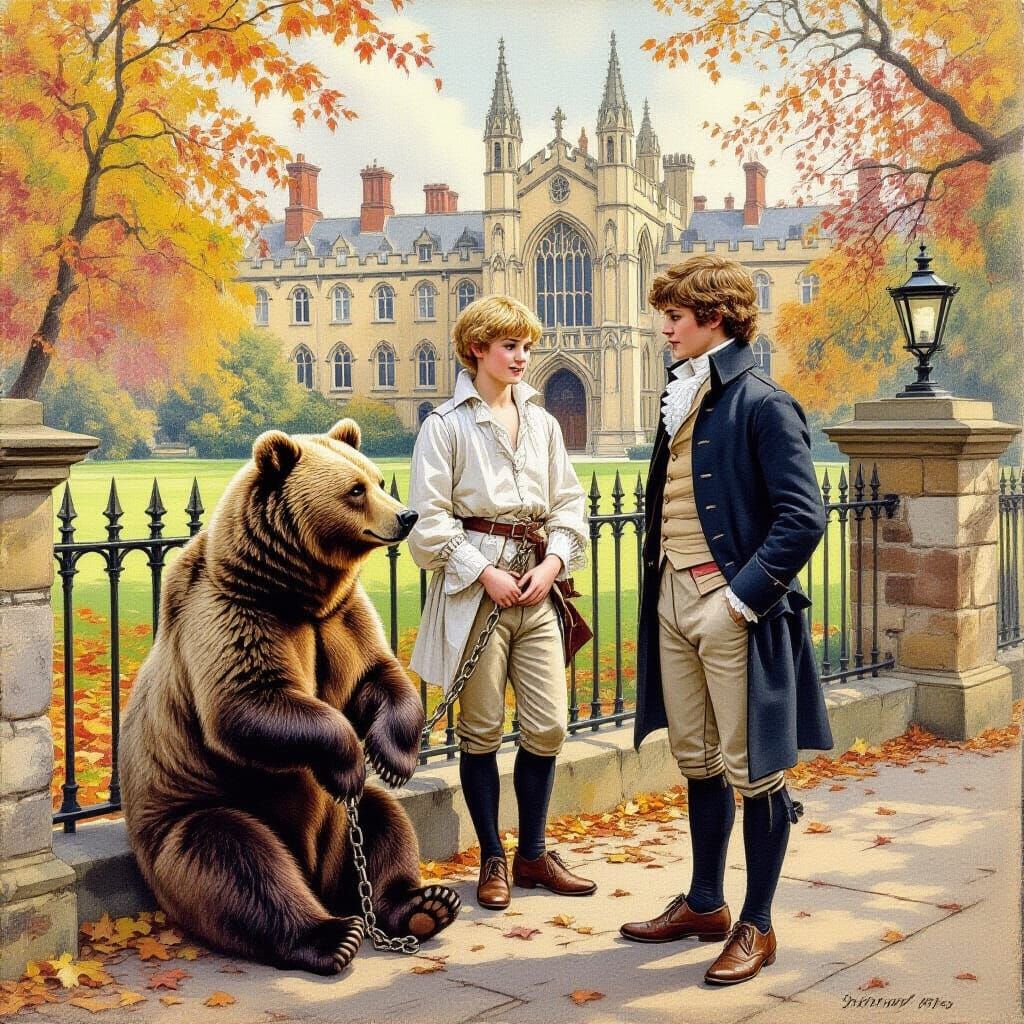 A colored charcoal drawing on rough cardboard in the style of John Hoppner. Time is 1805 autumn, spot is the park of Trinity College, Cambridge, England.