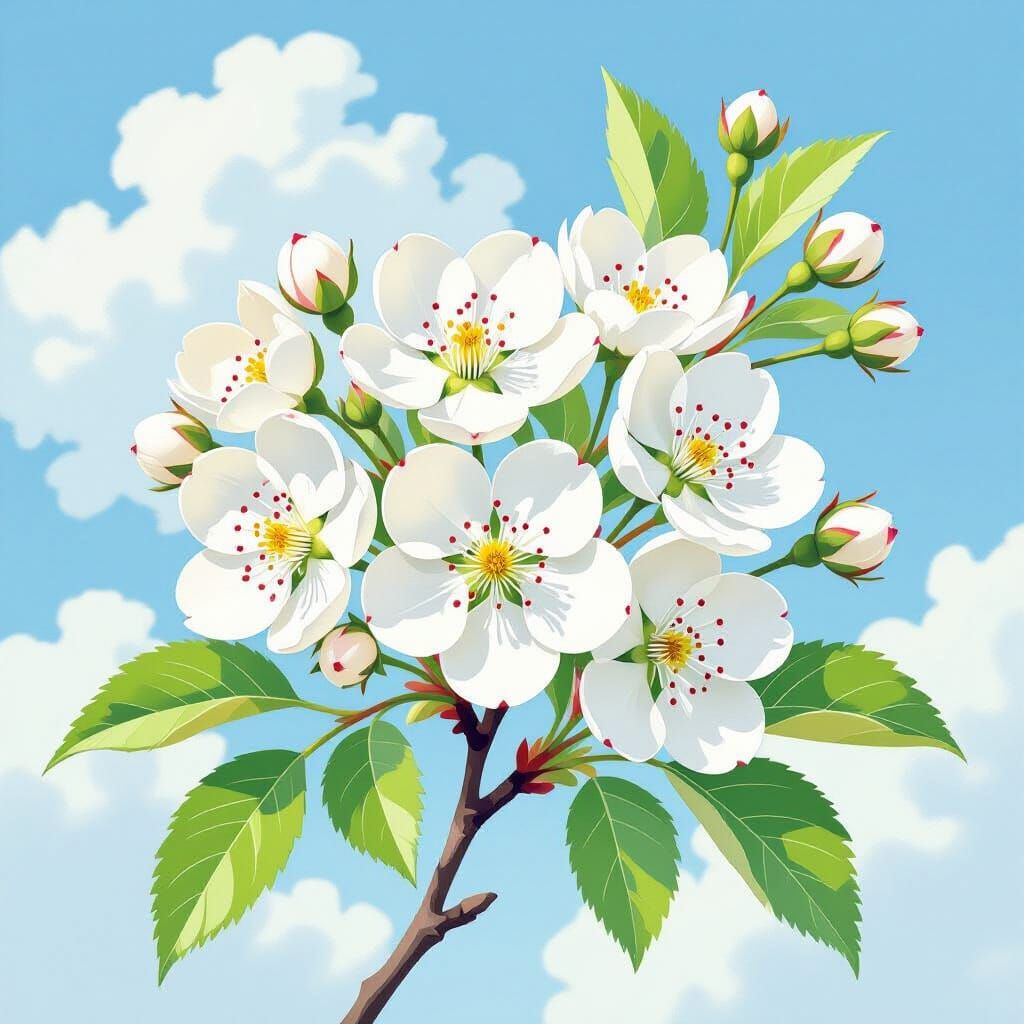 A vibrant watercolor painting of Hawthorn Blossom flowers with delicate white petals and pale yellow centers against a blue sky. The image captures the natural beauty with soft shading.