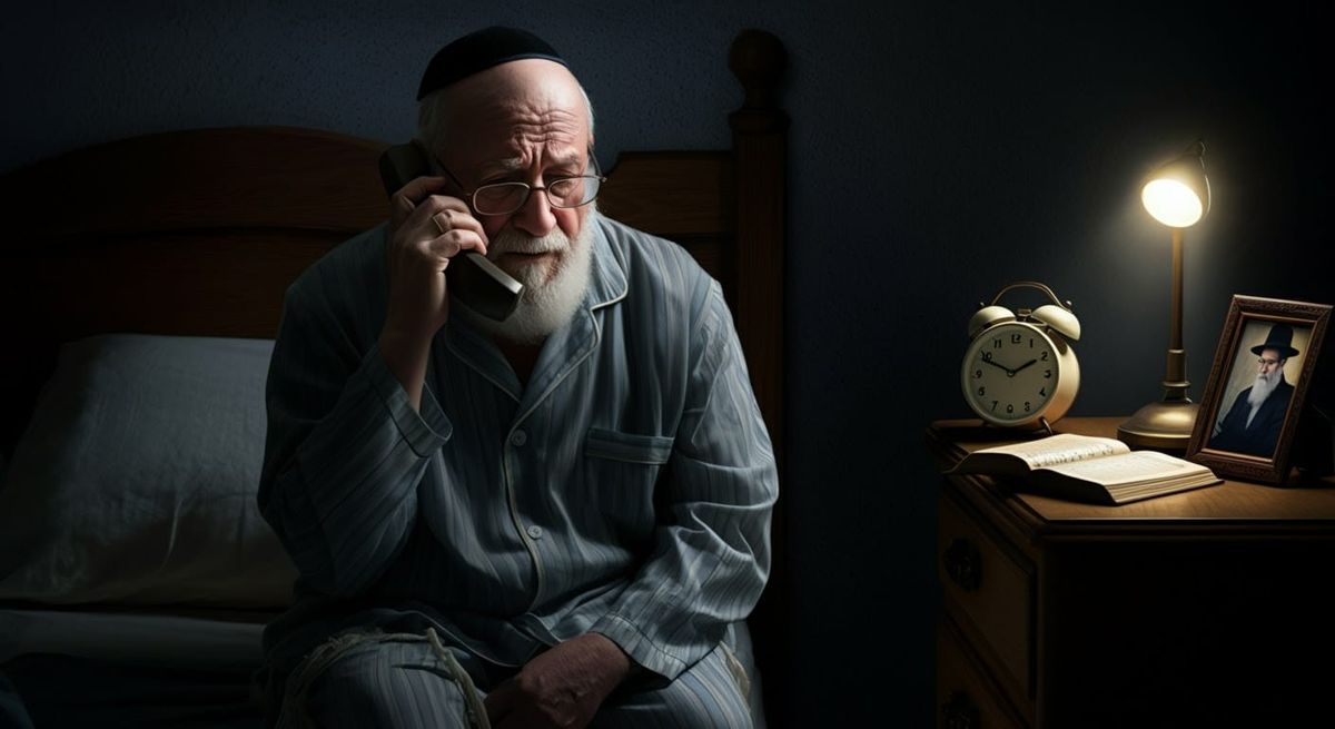 This image depicts an elderly Hasidic man in pajamas sitting on his bed in a dimly lit room, holding a phone with a concerned expression. The digital comic art style emphasizes emotional tension.