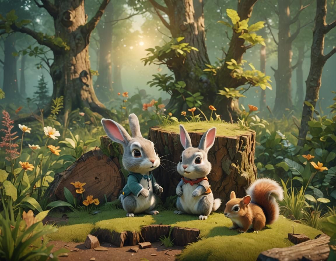 This image shows a cinematic 3D game cutscene featuring a bunny and a squirrel on a tree stump in a misty forest. The image is rendered with vibrant colors and realistic textures.