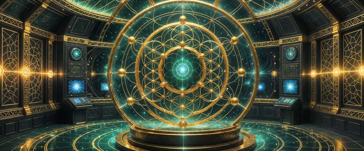 This image depicts a control room for a new Earth simulation, featuring a mystical quantum computer built from sacred geometry, forming a luminous energy grid with flowing matrix code and light waves.