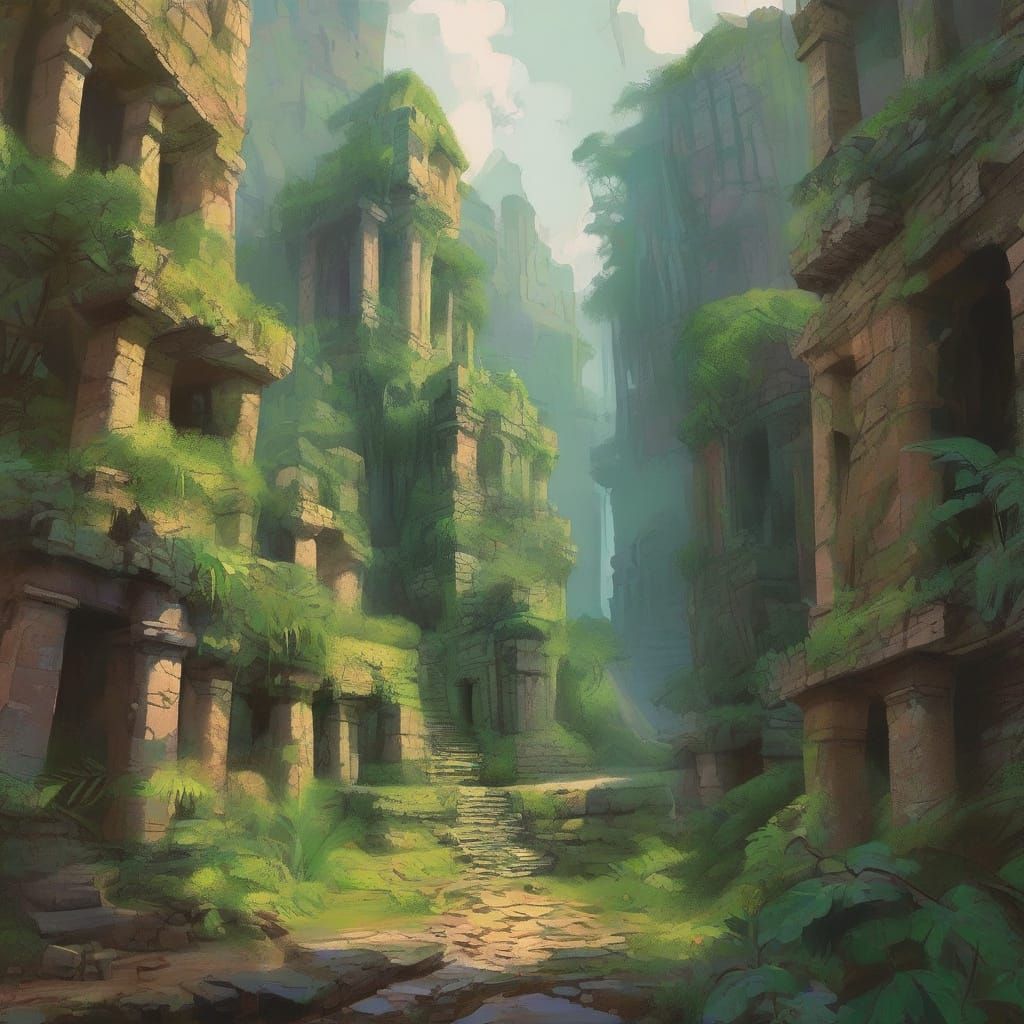This splash art illustration depicts a vibrant, overgrown Inca lost city with ancient stone architecture. Moody atmospheric lighting highlights the jungle's emerald and jade foliage amongst textured ruins.