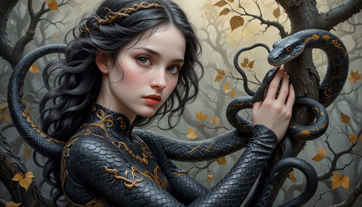 A close-up portrait of a girl holding a snake in the shadow of a tree. The scene is rendered as an ultra detailed oil painting with vivid colors and deep shadows in a surreal expressionist style.