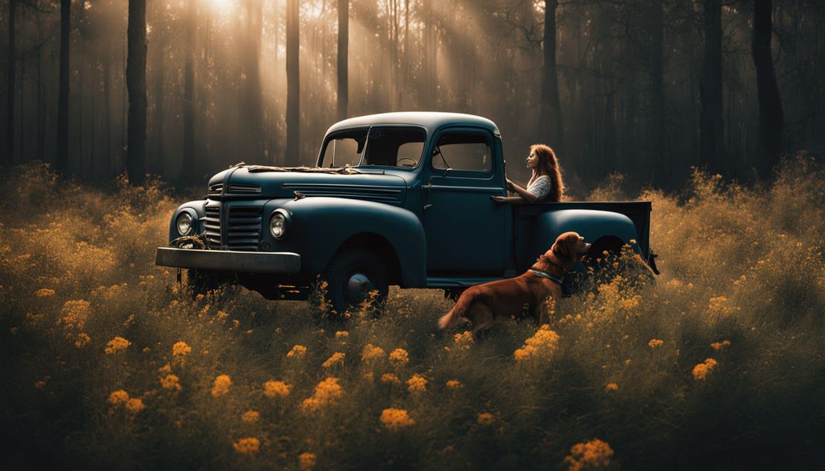 A surreal oil painting captures a woman with auburn hair, adorned with feathers and flowers, sitting on a vintage truck. Ethereal light and dark fantasy elements create a dreamlike atmosphere.
