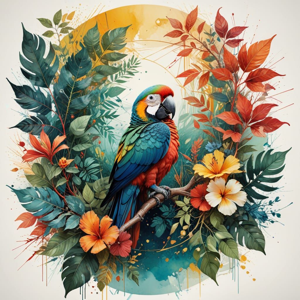This image captures a kaleidoscope of colors in a lush jungle setting, with a striking parrot perched amidst verdant leaves and tropical blooms. Soft watercolor gradients and delicate line work evoke a sense of harmony and movement, creating a poetic and surreal celebration of nature's beauty.