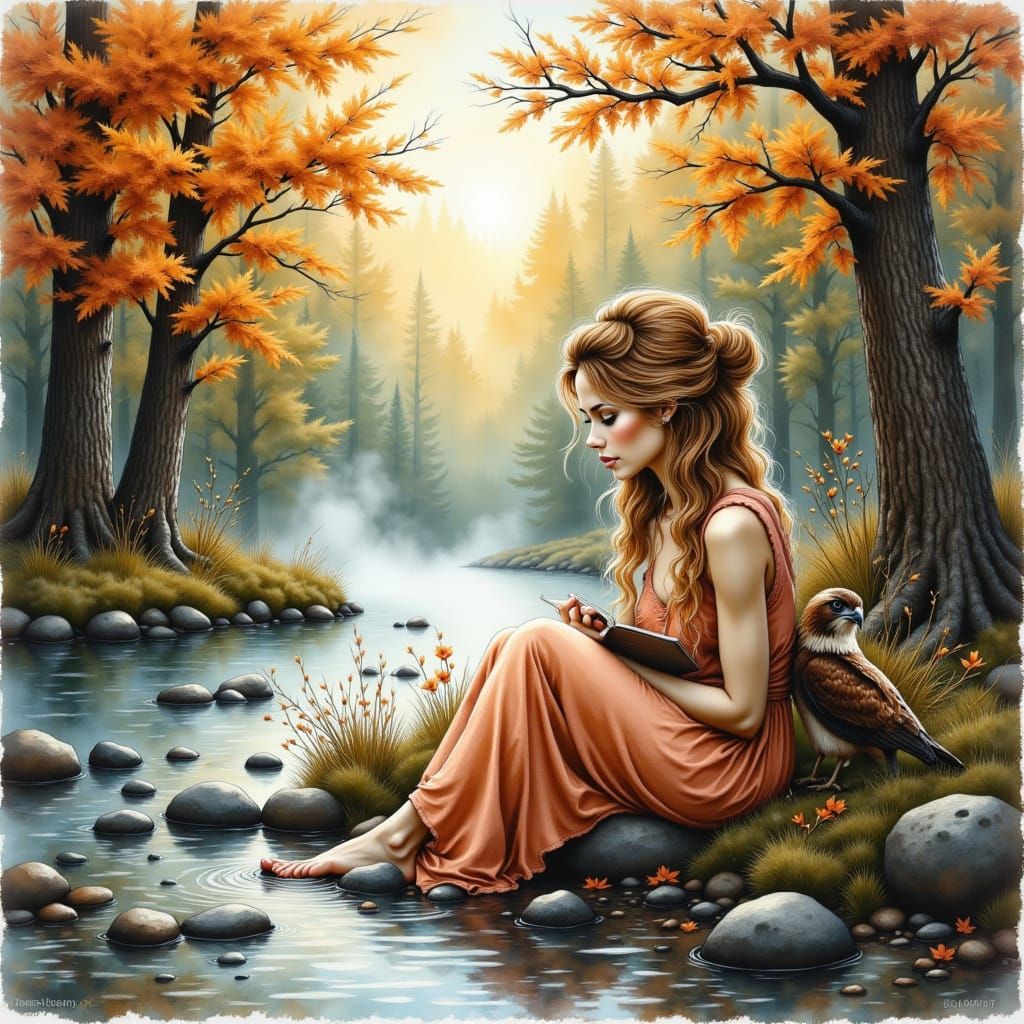 This image depicts a woman and a falcon resting by a river in a forest. It features a fluid watercolor style combined with oil painting gradients and coffee art textures for an ethereal aesthetic.
