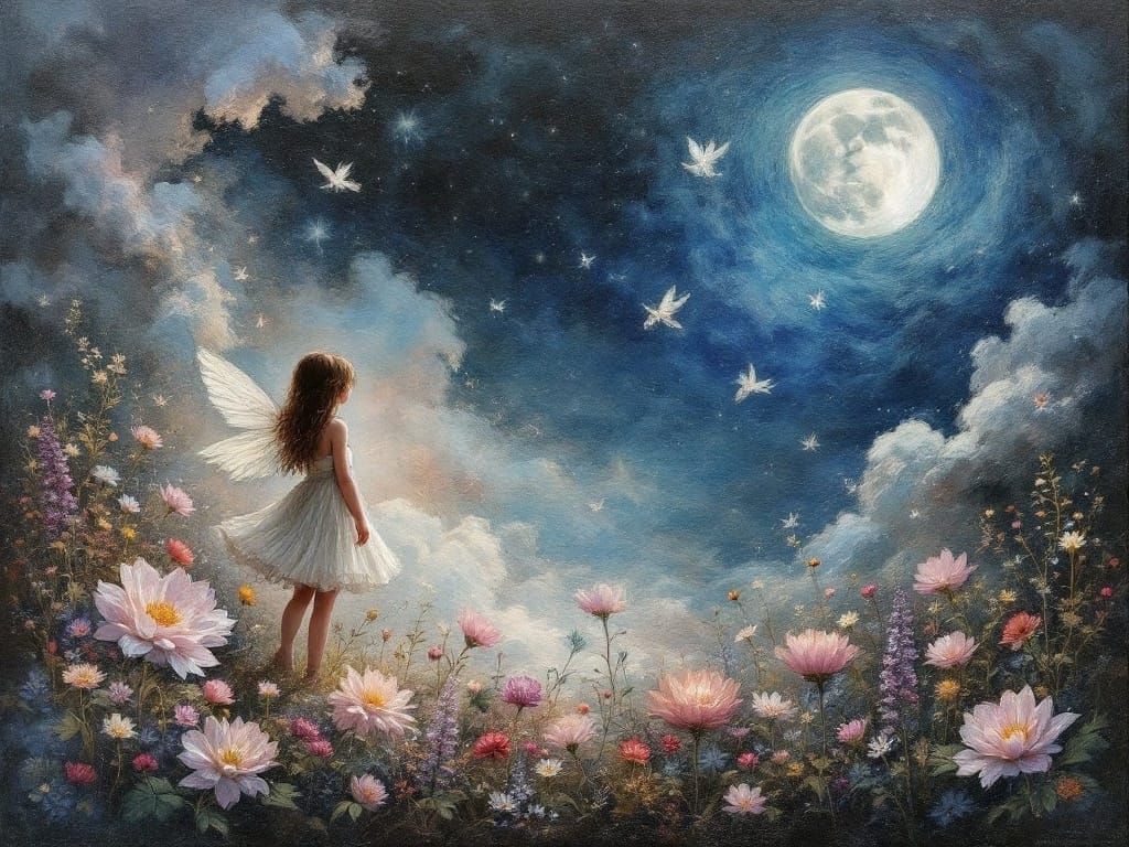 This enchanting image features a delicate little girl amidst a whimsical fairy world, set against a stunning double-exposed moonlit backdrop, with intricate oil painting textures and an abundance of vibrant flowers.