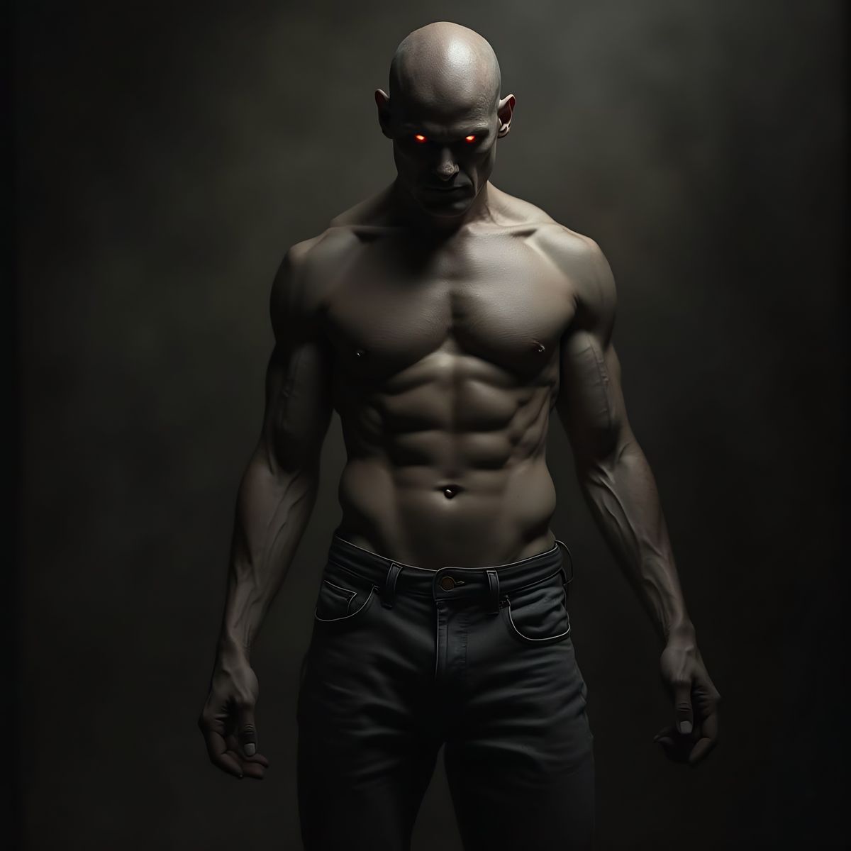 This image depicts a muscular demon figure with glowing eyes, clad in ripped jeans, and standing in shadow. The photorealistic rendering highlights the demon's detailed musculature.