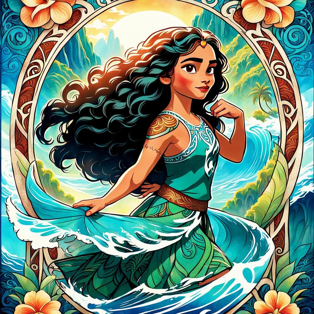 A vibrant Art Nouveau poster of Disney's Moana. The image features flowing lines and natural motifs, typical of the style, to capture the spirit of the animated film.