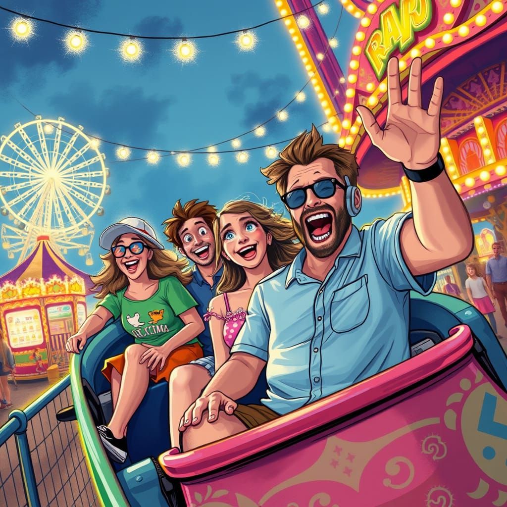 This image shows excited people riding a roller coaster at a county fair. The image is rendered in a whimsical style, with vibrant colors and dynamic sketching.