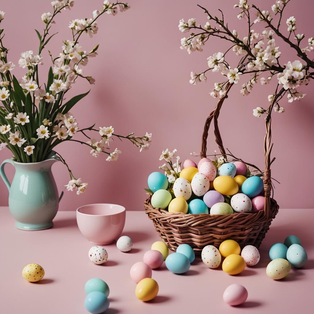 This image shows a basket filled with colorful Easter eggs and vibrant flowers, set on a table against a pink backdrop. The scene is presented with cinematic lighting and a film-like quality.
