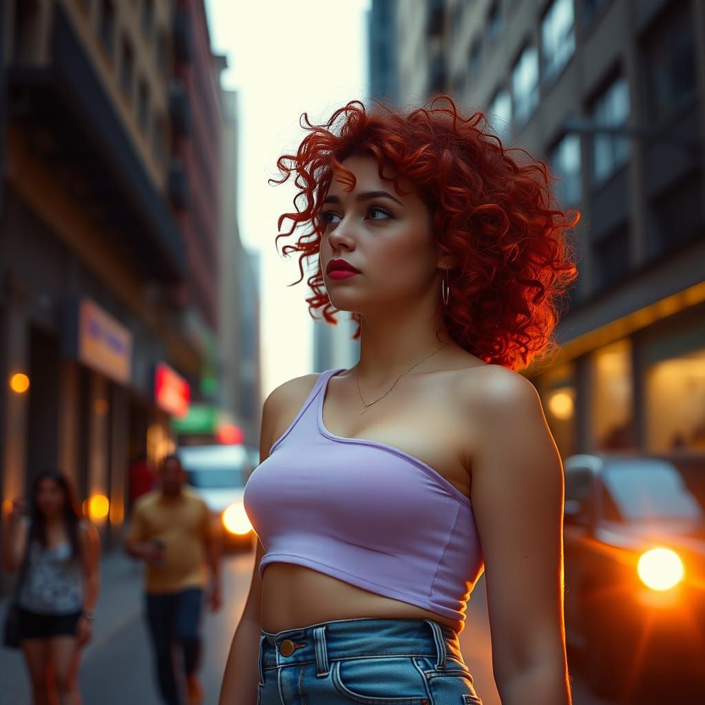 This image captures a young man with curly red hair and blue eyes, wearing a pastel lavender top and cutoff jeans, lost in thought on a city street. Shot in a cinematic style reminiscent of 35mm film, with warm lighting and a nostalgic aesthetic.
