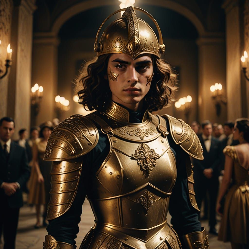 A cinematic film still of a 21-year-old Italian socialite with a striking golden gladiatorial costume and mask, set against warm golden lighting with deep shadows and a nostalgic, vintage tone.