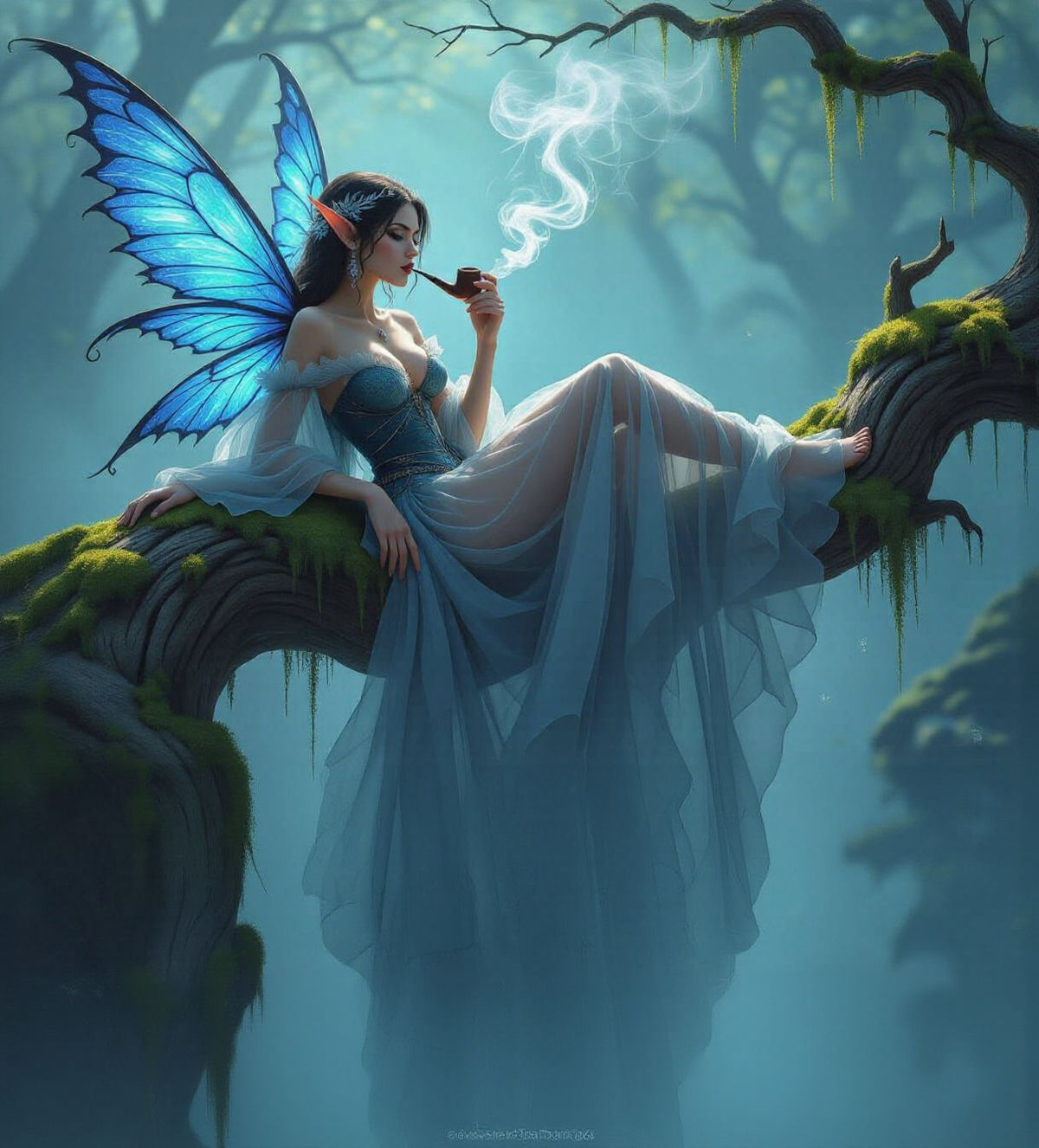 A striking picture of a fairy reclining on a mossy branch and smoking a pipe. Dragon-shaped smoke billows from the pipe in this detailed matte painting with deep blues, reds and greys.