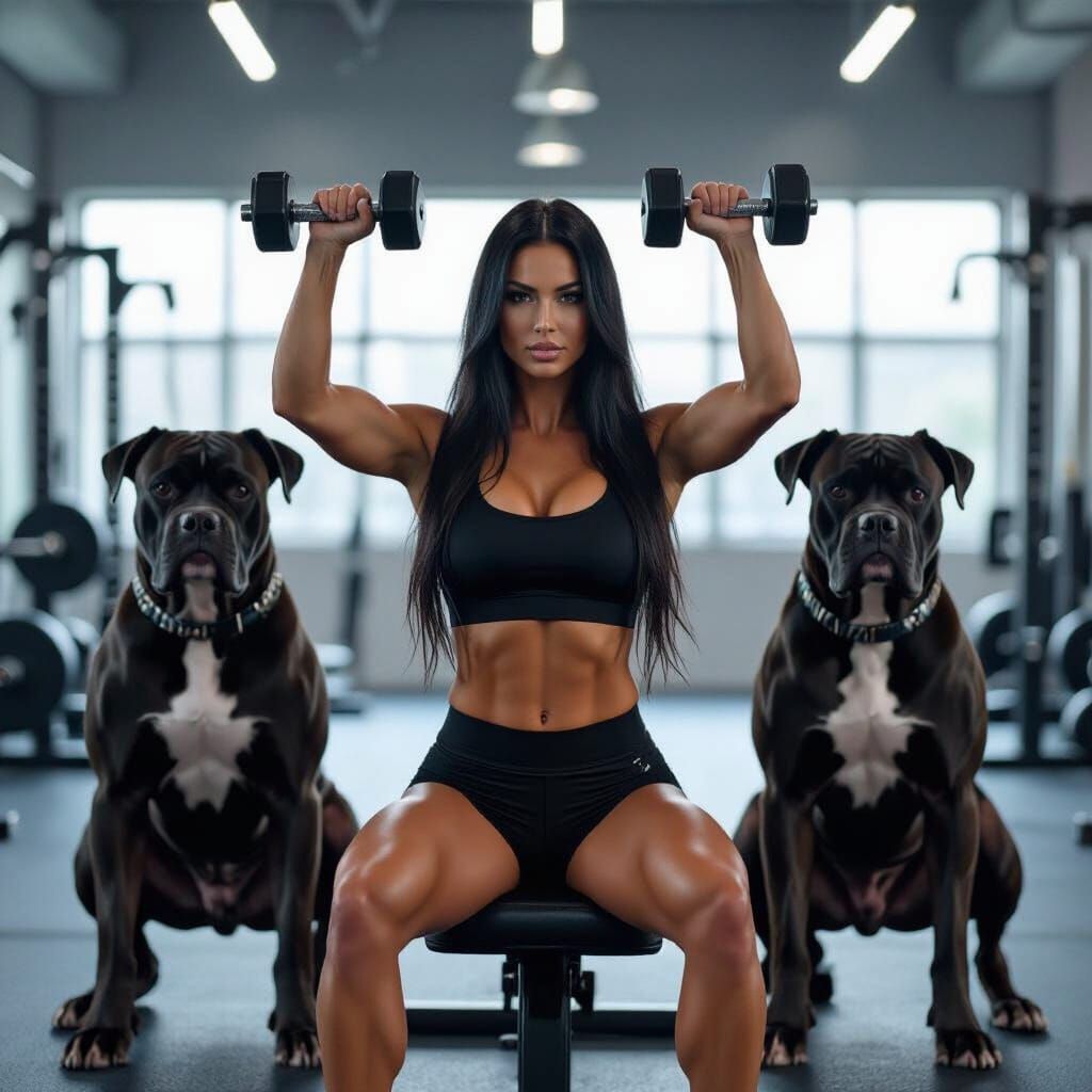 This image shows a fit woman lifting weights in a modern gym. Two large black dogs sit beside her. The image has cinematic lighting and a photorealistic aesthetic with film grain.