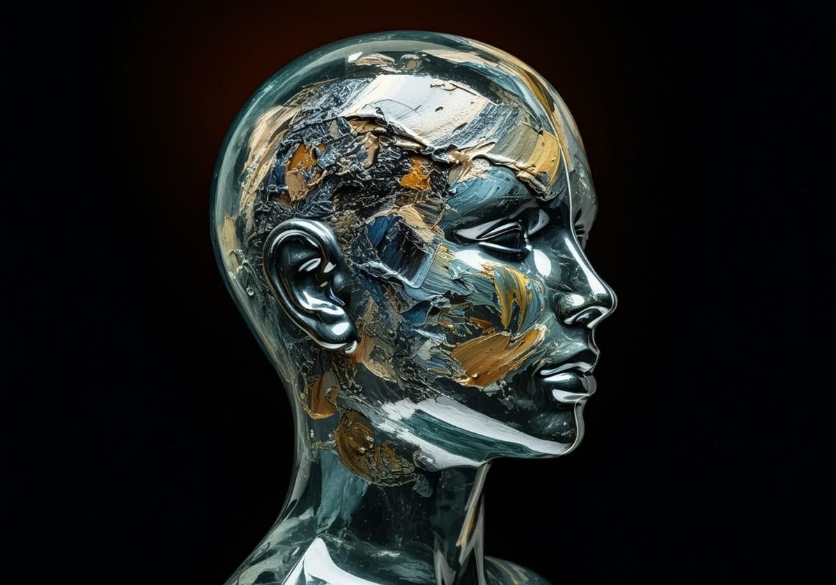thickened super thick viscous rich deep tactile oil paint applied with crumpled steelwool and a shiny masterpiece of time-lapse tenebrism linewaves of intensity threatening to burst through from inside the glass head struggling to contain them linewaves of pressure push from every angle in on the head ...