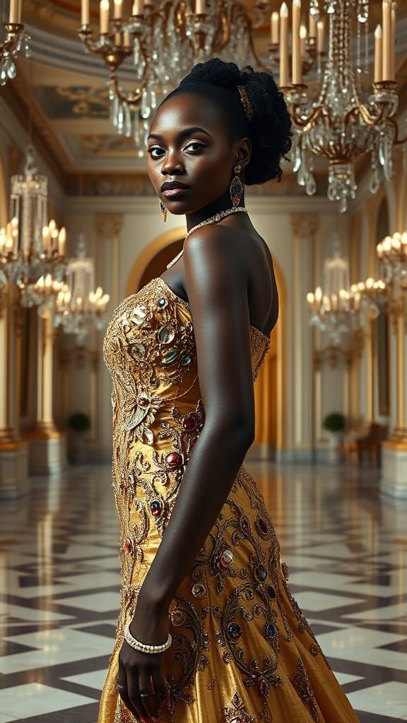 A portrait of a woman in a golden gown adorned with jewels and pearls, standing in a ballroom with chandeliers and marble floors. The image evokes Renaissance elegance with photorealistic detail.