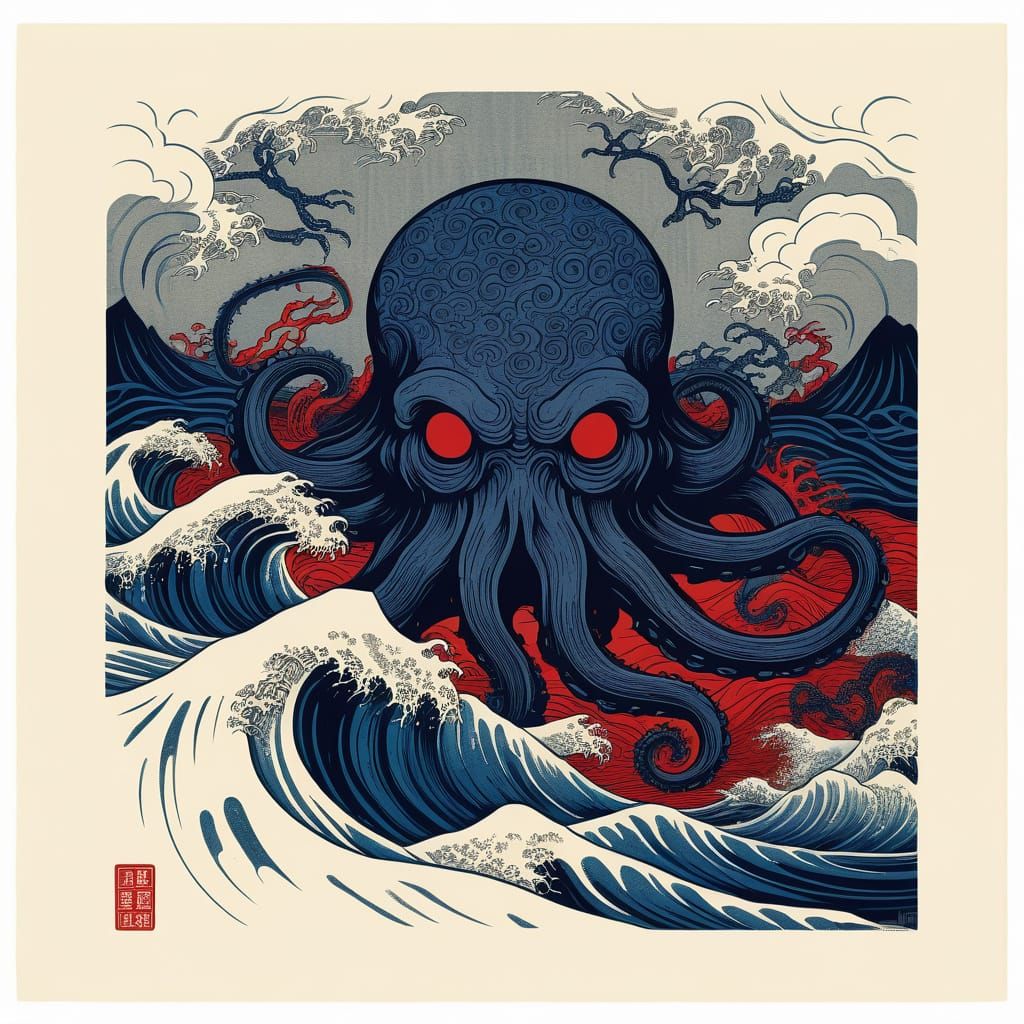 This image shows Cthulhu rising from the ocean in a Japanese Ukiyo-E woodcut print style. The artwork features intricate lines, crashing waves, and a vibrant indigo and crimson color palette.