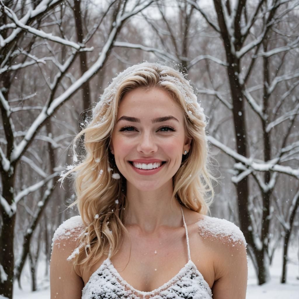 This image shows a blonde woman in a snowy landscape, lightly dressed and attempting a smile. The stark white background contrasts with her fair features.