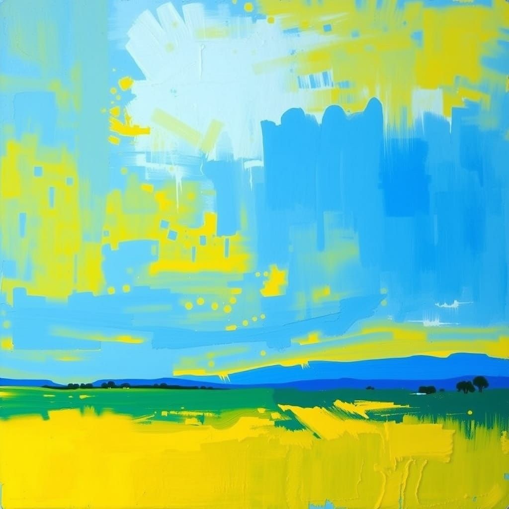 A vibrant abstract image featuring blue and yellow hues in a color field style. Expressive brushstrokes and ethereal landscape elements combine in this artwork.
